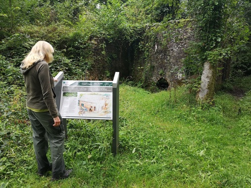 The map shows the route to the ruins of the mill and the former fishponds. There is an additional information panel by the mill ruins. The route between the mill and fishpond follows a narrow path, which can be slippery and muddy.
